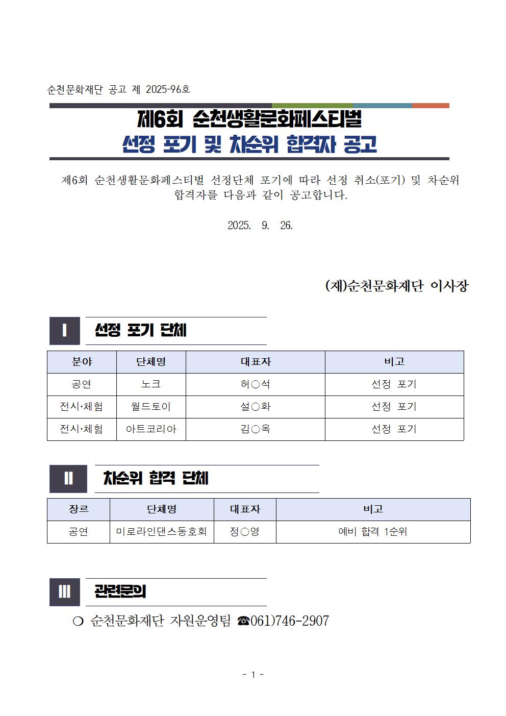 제6회 순천생활문화페스티벌 선정 포기 및 차순위 합격자 공고