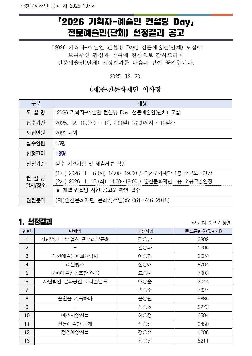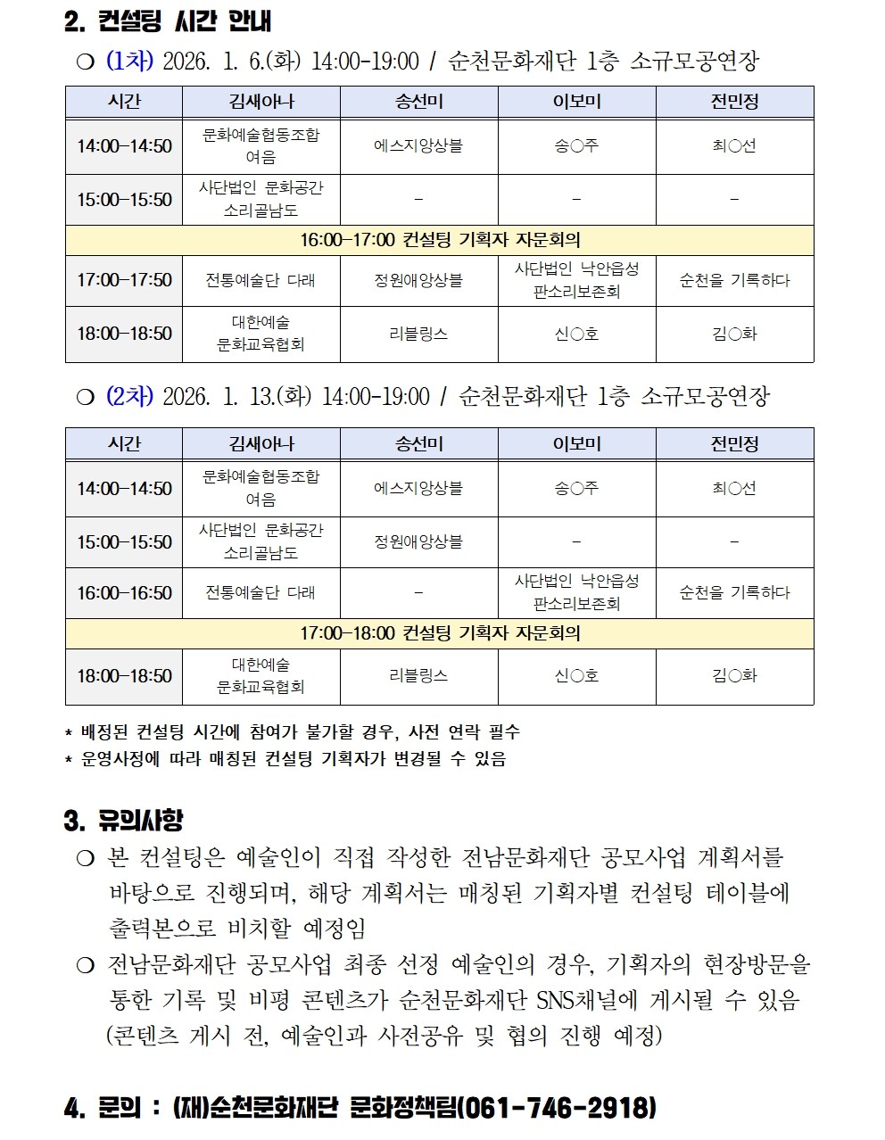 「2026 기획자-예술인 컨설팅 Day」전문예술인(단체) 선정결과 공고