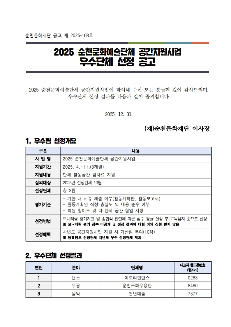 「2025 순천문화예술단체 공간지원사업」 우수단체 선정 공고