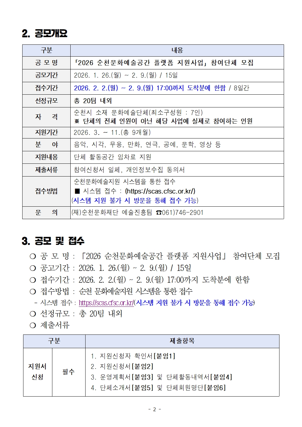 접수방법 : 순천문화예술지원시스템(https://scas.cfsc.or.kr/)을 통한 접수
