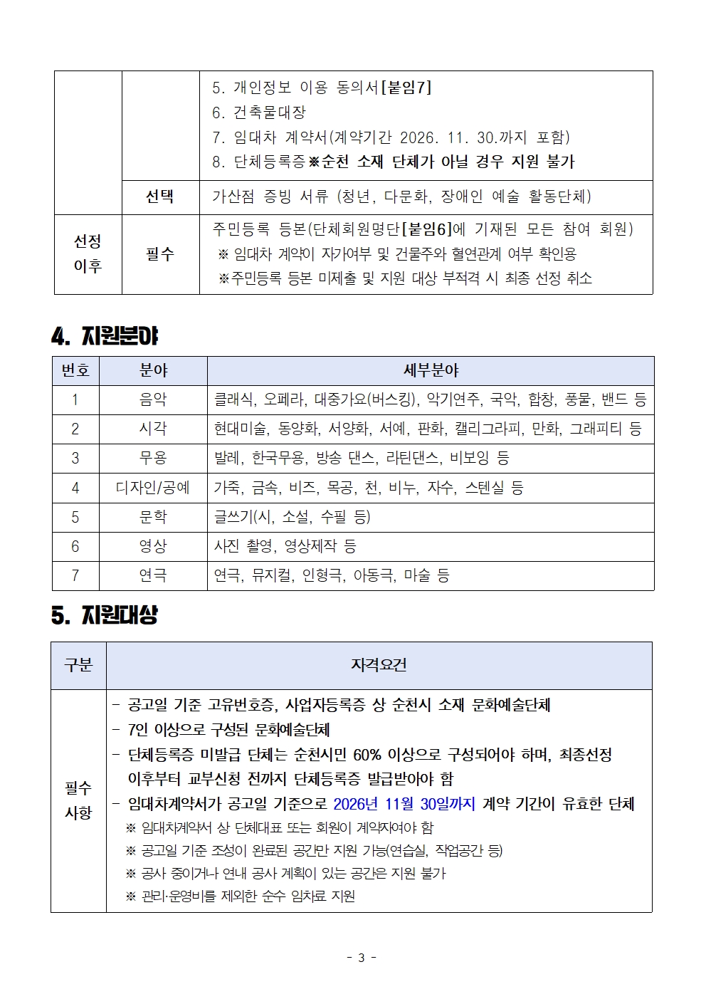 지원대상 : 순천시 소재의 문화예술단체(최소 구성원 7인)