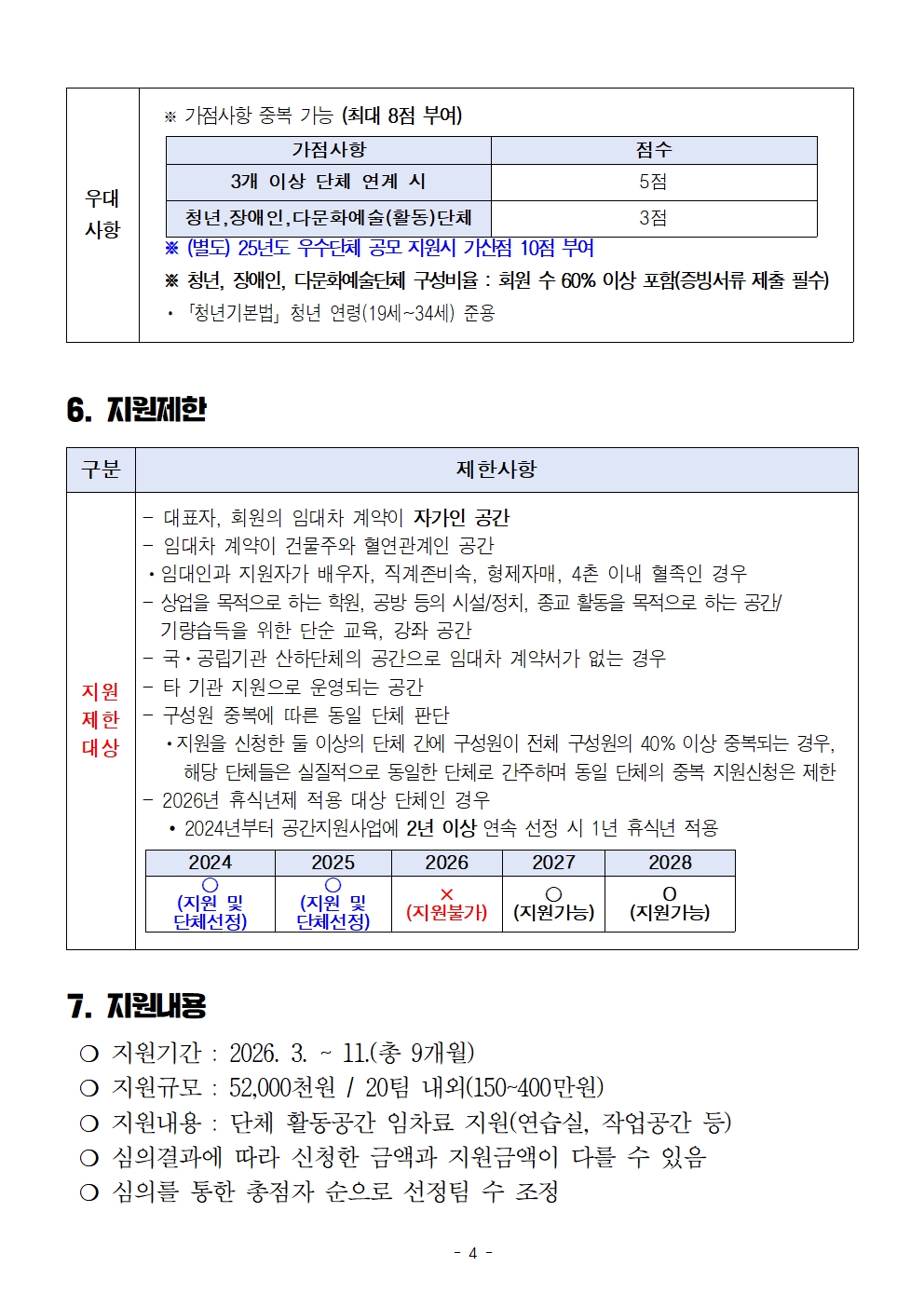 지원내용 : 단체 활동공간 임차료 지원(단체당 150~400만원)