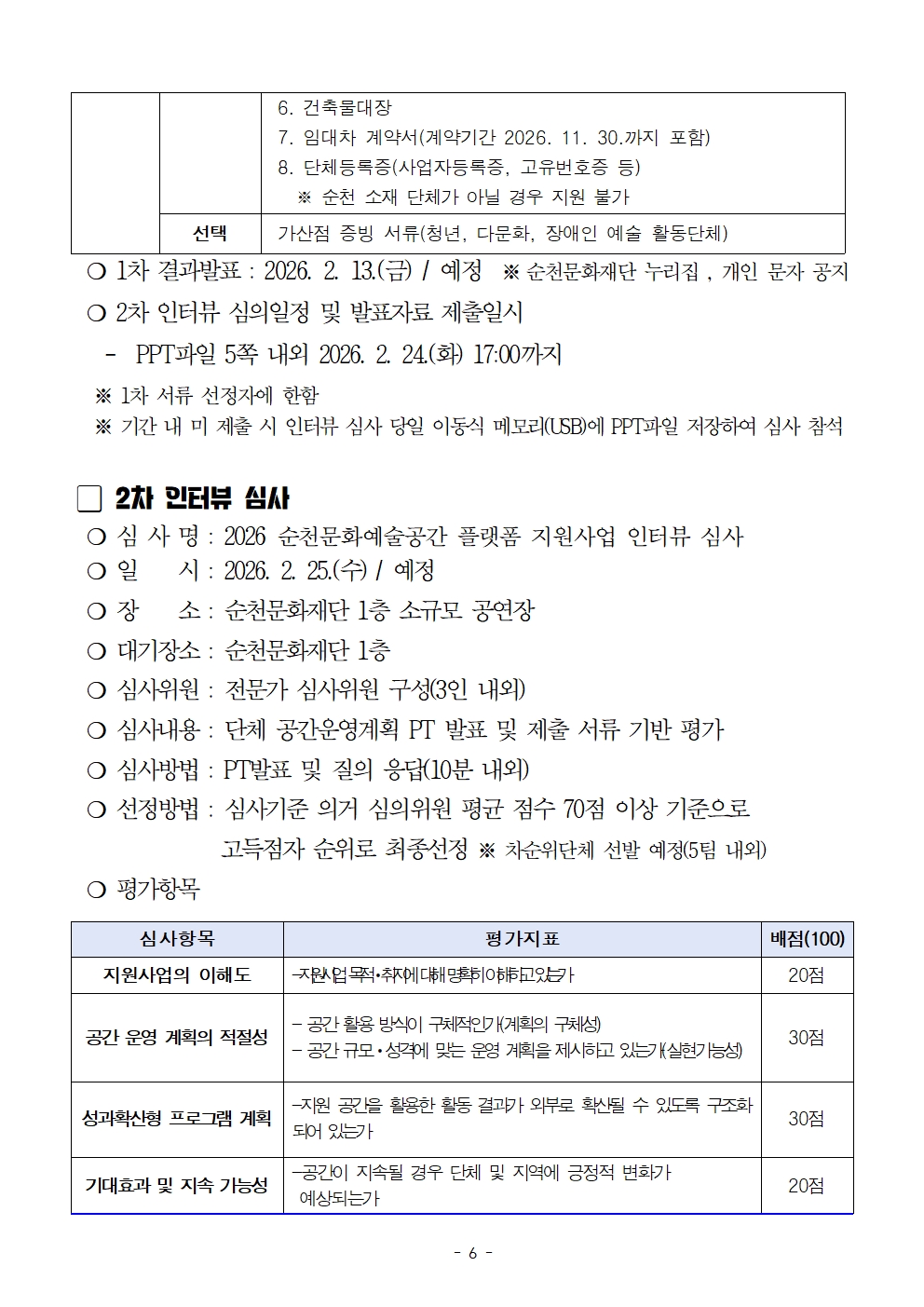 (재)순천문화재단에서는 지역 내 활동하고 있는 순천문화예술단체들의 안정적인 활동 기반을 조성하고, 공간 운영과 예술활동 성과가 지역사회로 공유될 수 있도록「2026 순천문화예술공간 플랫폼 지원사업」을 추진하고 있습니다. 관내 문화예술단체의 많은 관심과 참여 바랍니다.