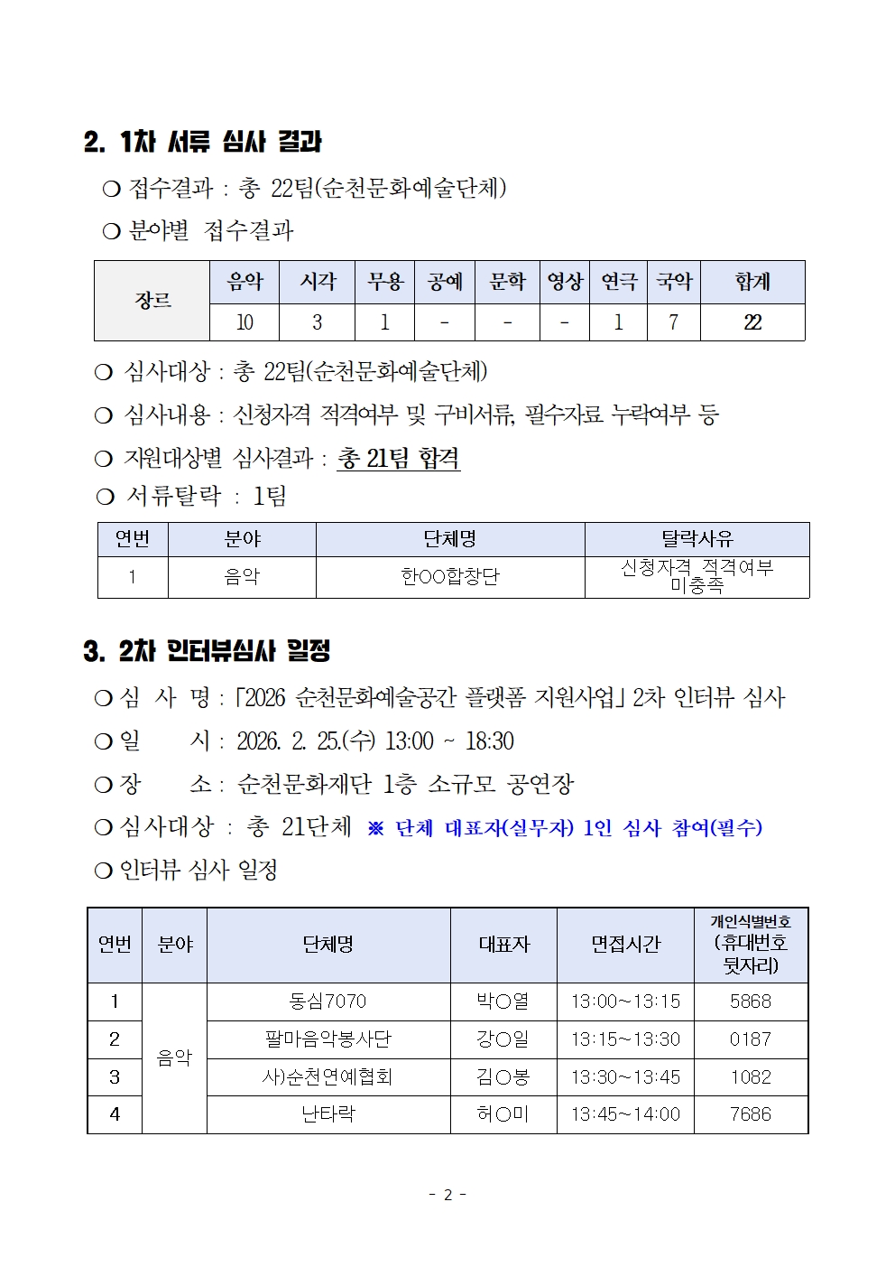 「2026 순천문화예술공간 플랫폼 지원사업」 서류 심사 결과 및 2차 심사 일정 공고