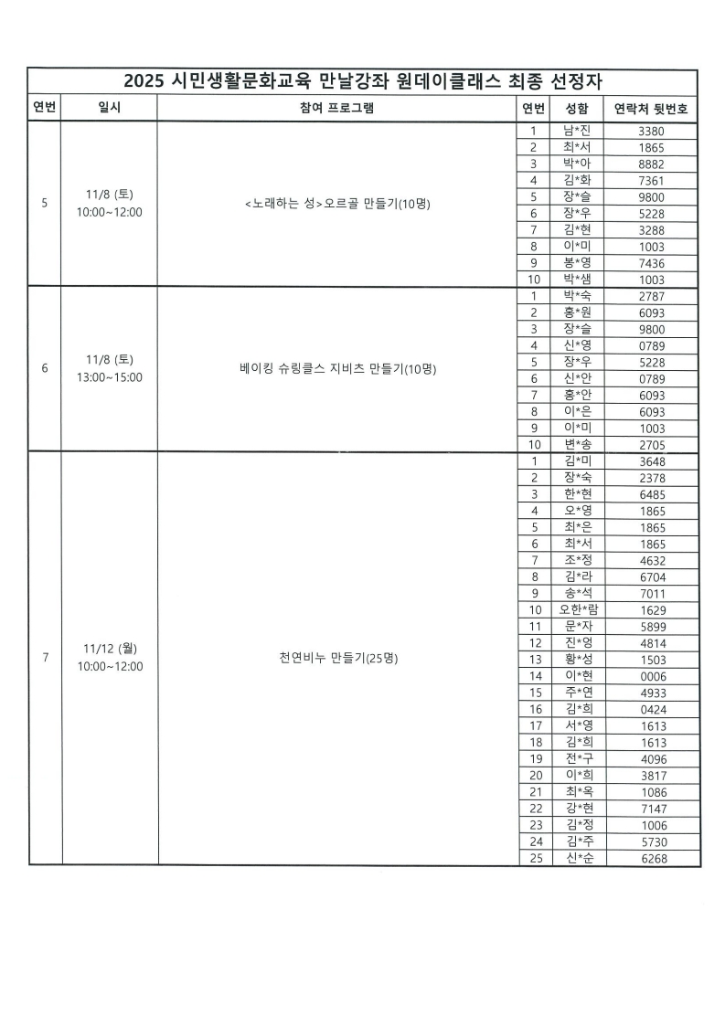 다음과 같이 2025 시민생활문화교육 만날강좌 원데이클래스 최종 선정자 명단을 게시합니다.