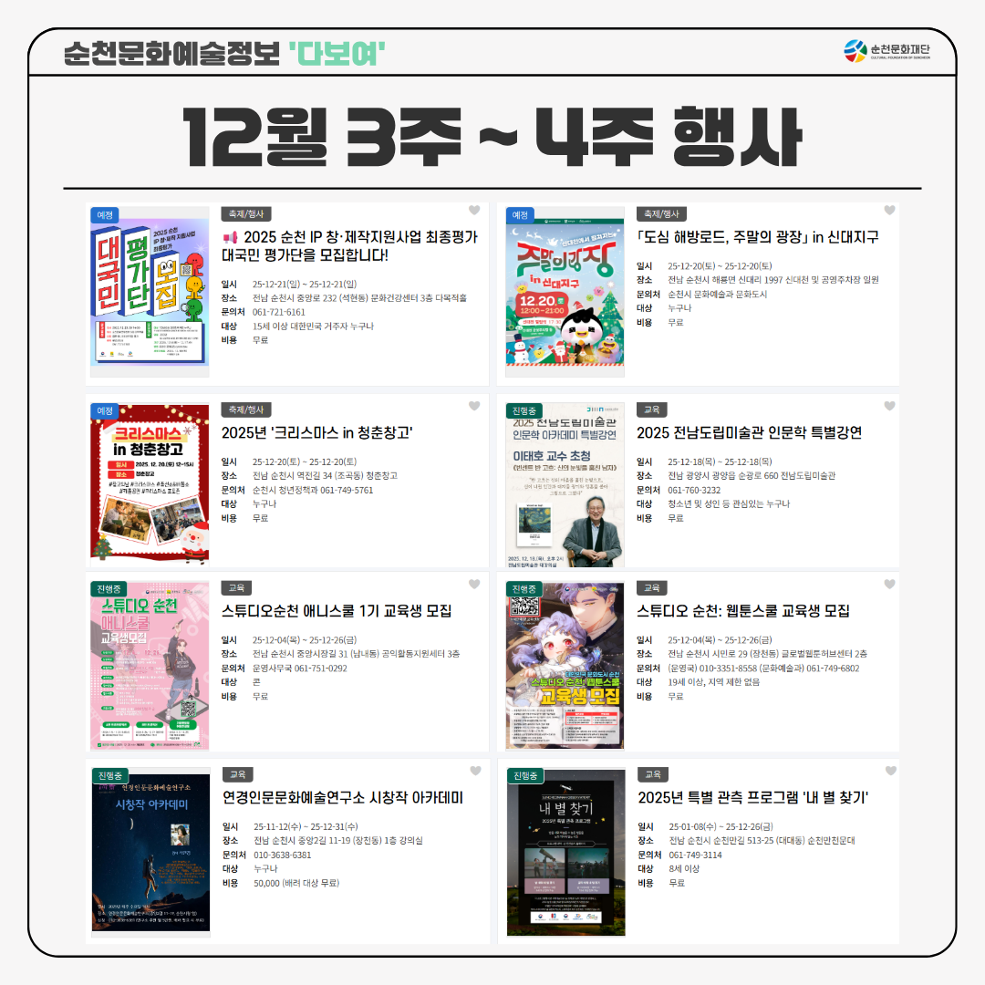 순천문화예술정보 '다보여'가 전하는 12월 3주와 4주 차 주요 행사 안내입니다!