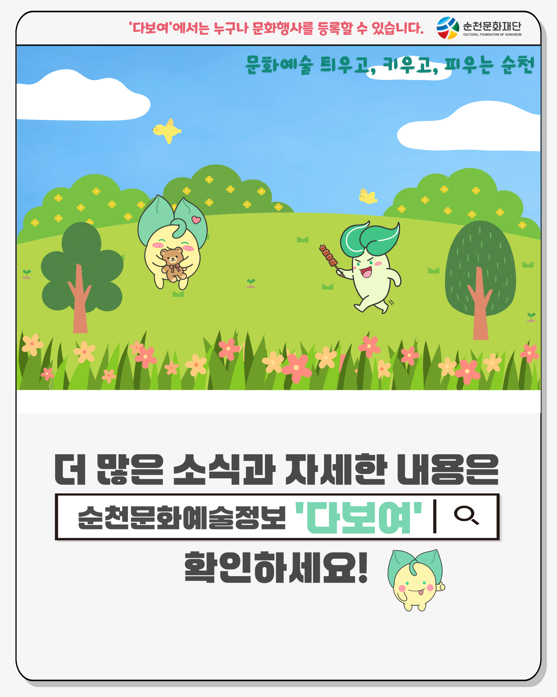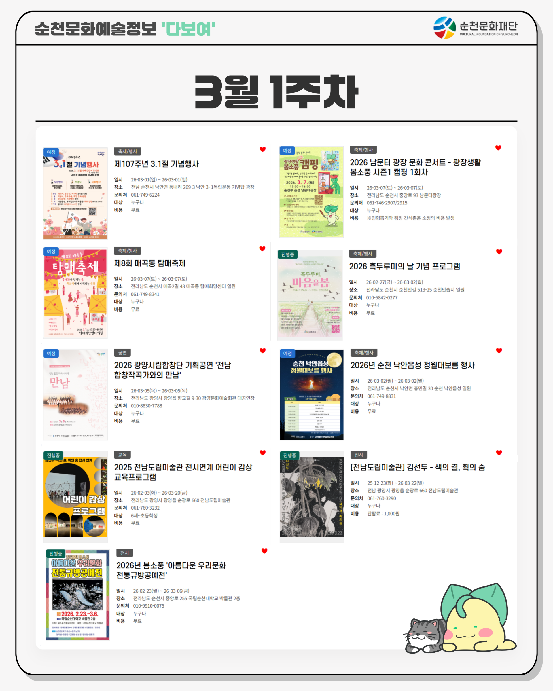 #순천문화재단 #순천문화예술정보 #다보여 #순천문화소식 #3월1주차 #순천축제 #순천공연 #순천전시 #3.1절기념행사 #매곡동탐매축제 #남문터광장 #순천여행 #순천가볼만한곳 #문화예술 #순천시 #광양시 #합창 #순천낙안읍성 #정월대보름 #흑두루미 #루미뚱이 #틔키피 #봄소풍 #삼일절 #순천대학교 #전남도립미술관 #매곡동