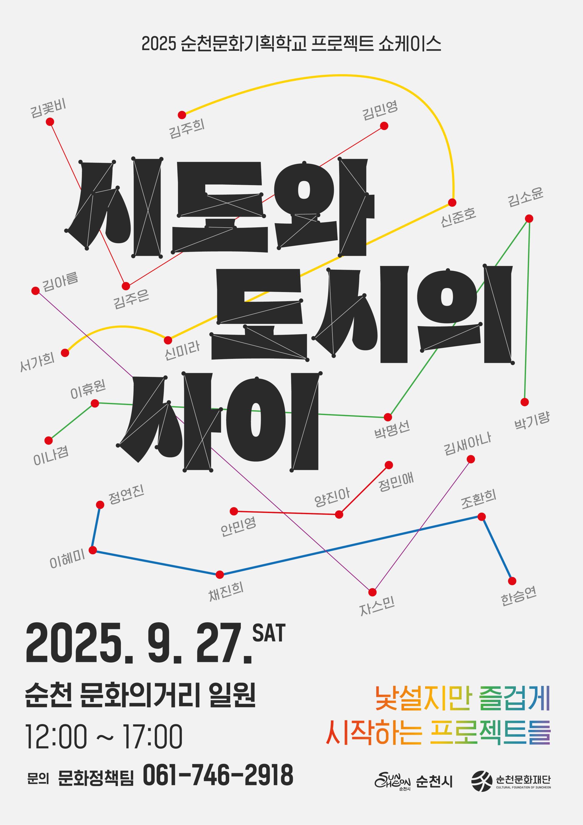 (재)순천문화재단은 오는 9월 27일 오후 12시부터 5시까지 문화의 거리 일원에서 2025 순천문화기획학교 프로젝트 쇼케이스「시도와 도시의 사이」(이하 시도와 도시의 사이)를 개최한다.