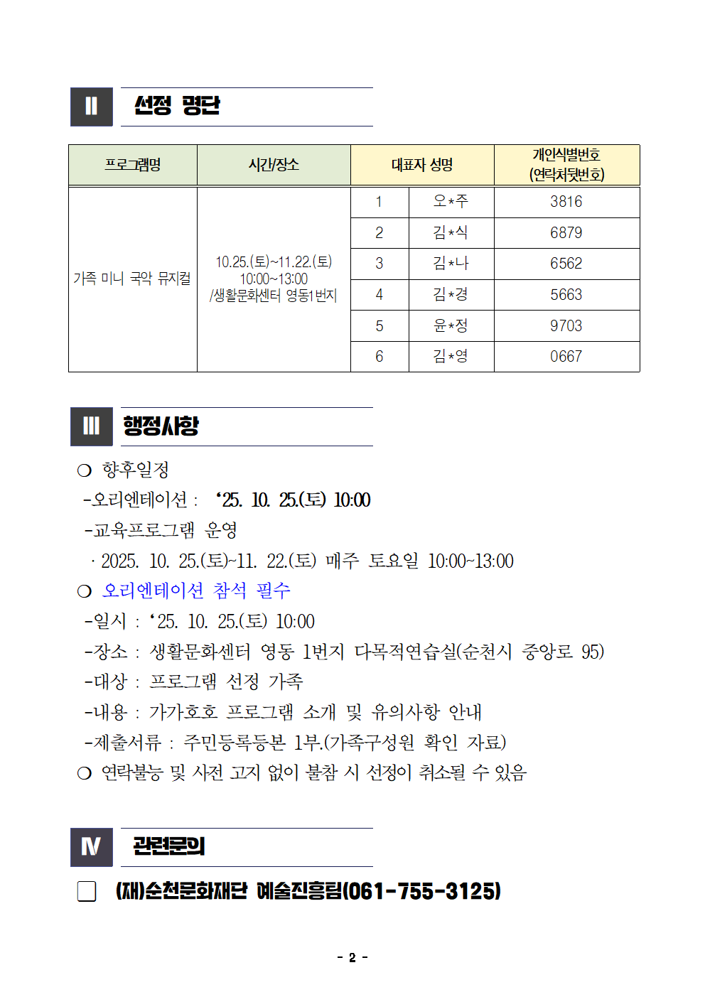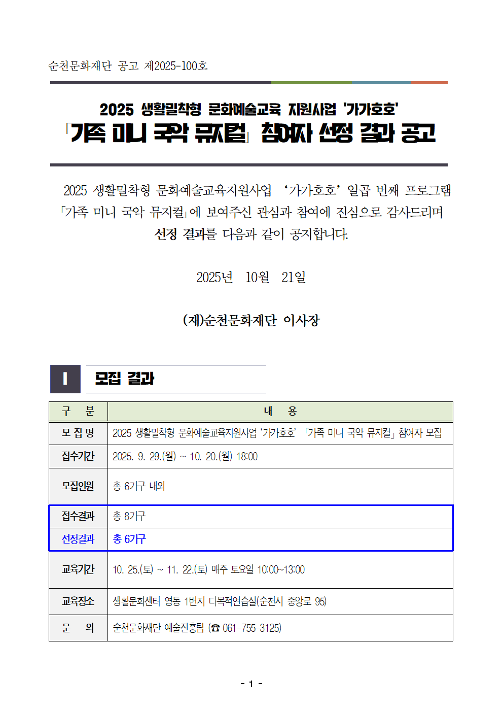 2025 생활밀착형 문화예술교육지원사업 '가가호호' 「가족 미니 국악 뮤지컬」참여자 선정 결과 공고