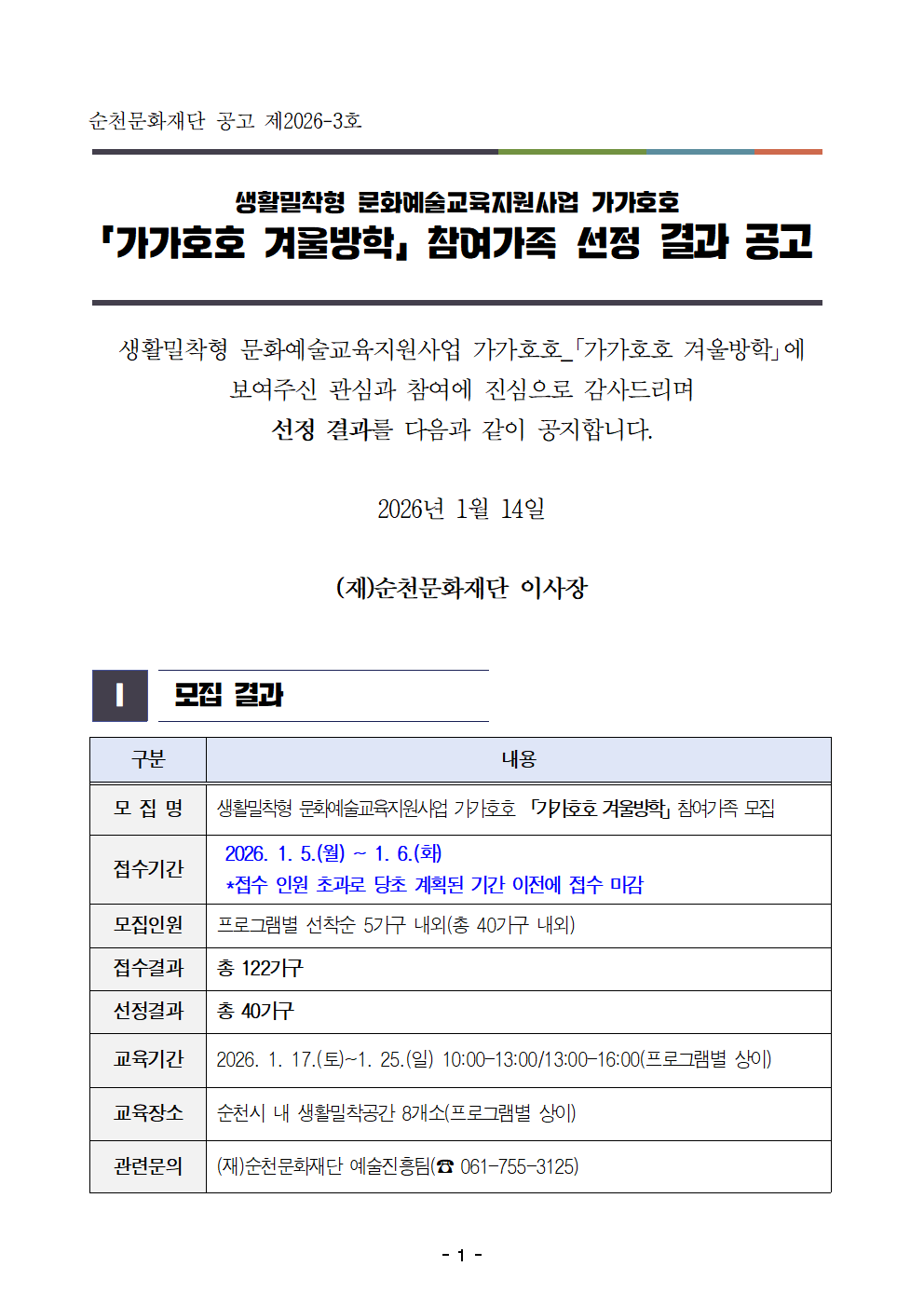 생활밀착형 문화예술교육지원사업 가가호호 「가가호호 겨울방학」 참여가족 선정 결과 공고