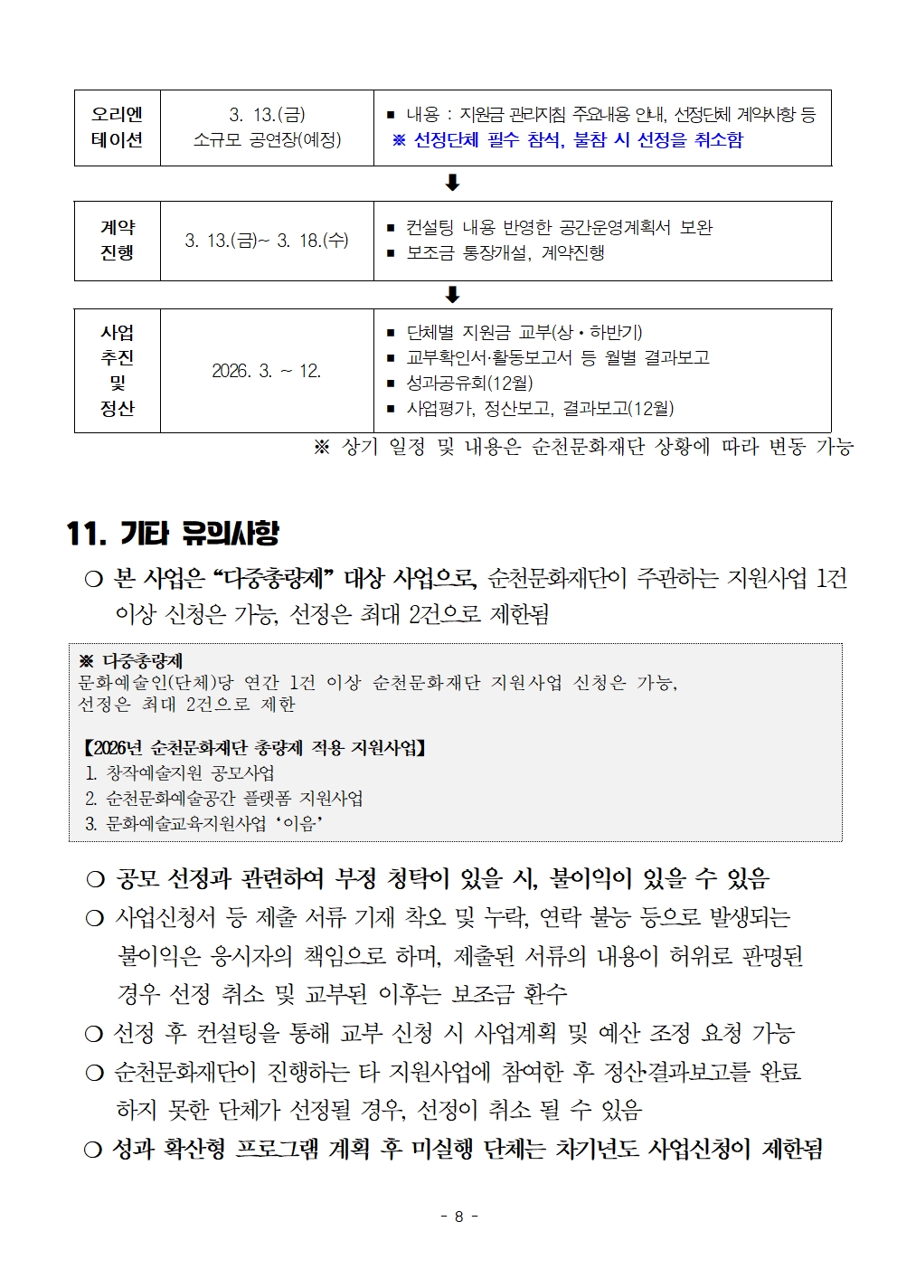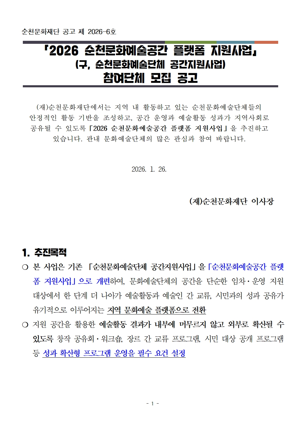 (재)순천문화재단에서는 지역 내 활동하고 있는 순천문화예술단체들의 안정적인 활동 기반을 조성하고, 공간 운영과 예술활동 성과가 지역사회로 공유될 수 있도록「2026 순천문화예술공간 플랫폼 지원사업」을 추진하고 있습니다. 관내 문화예술단체의 많은 관심과 참여 바랍니다.
