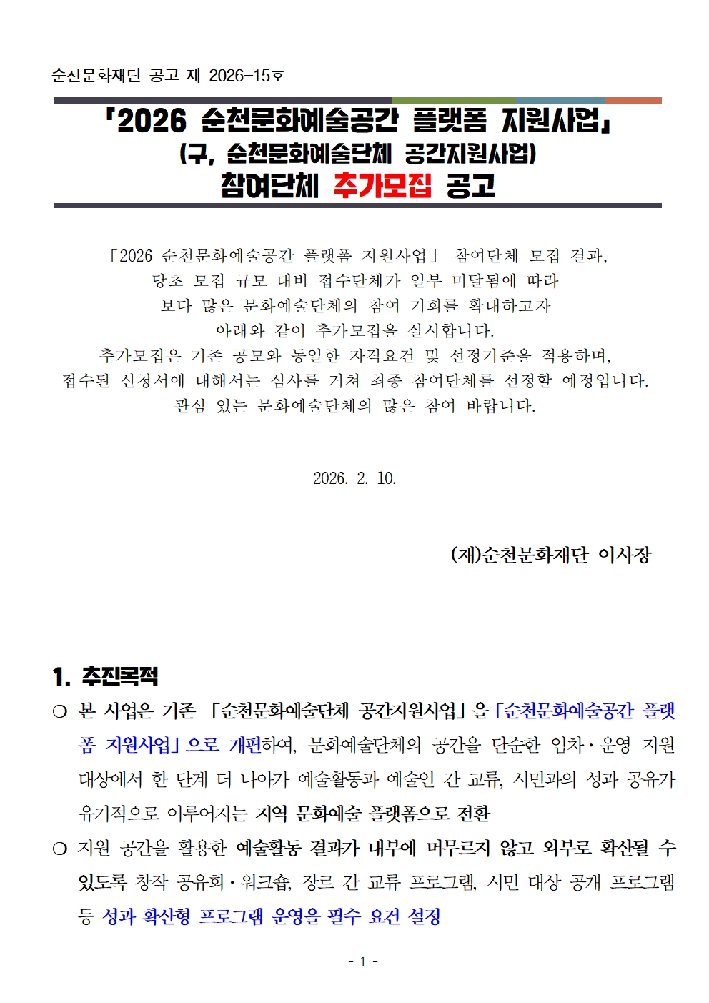 「2026 순천문화예술공간 플랫폼 지원사업」참여단체 추가모집