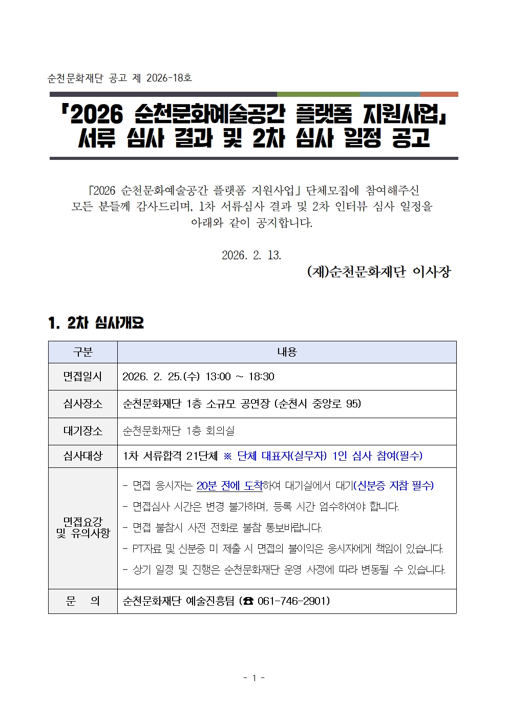 「2026 순천문화예술공간 플랫폼 지원사업」 서류 심사 결과 및 2차 심사 일정 공고