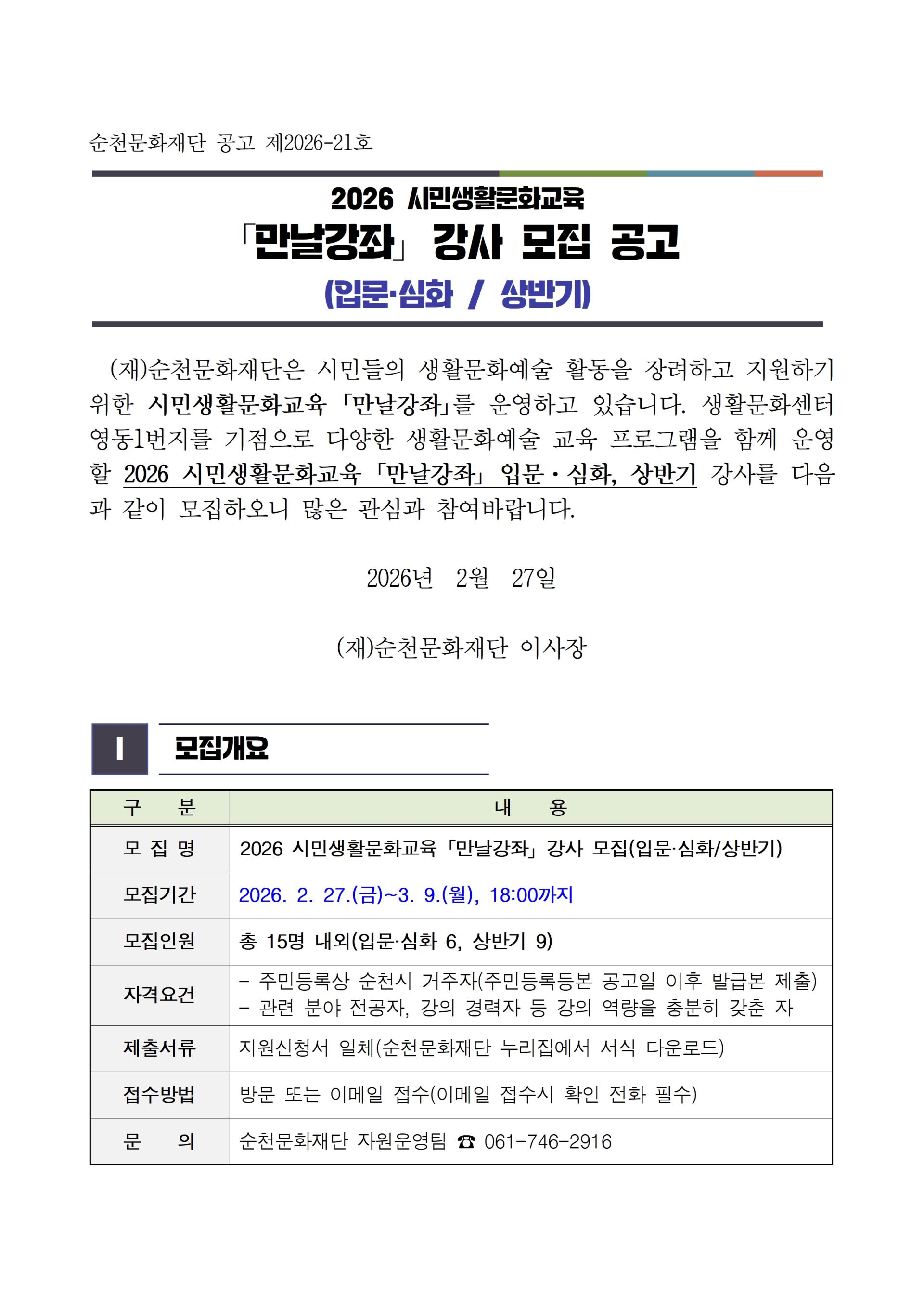 2026 시민생활문화교육 「만날강좌」 강사 모집(입문·심화/상반기) 공고 (~3. 9.(월) 18:00까지)
