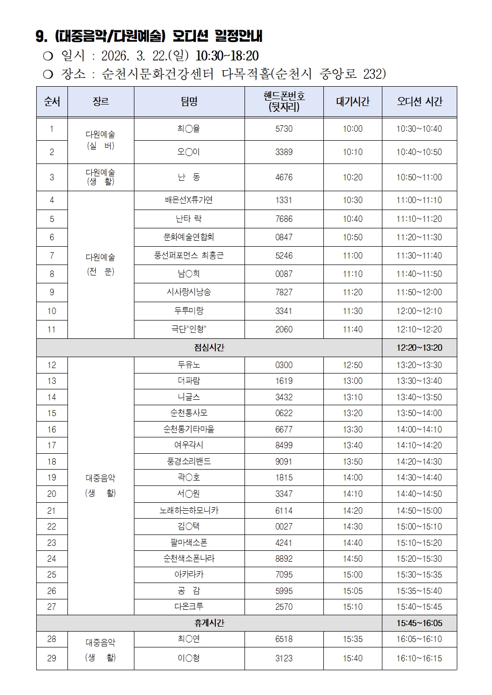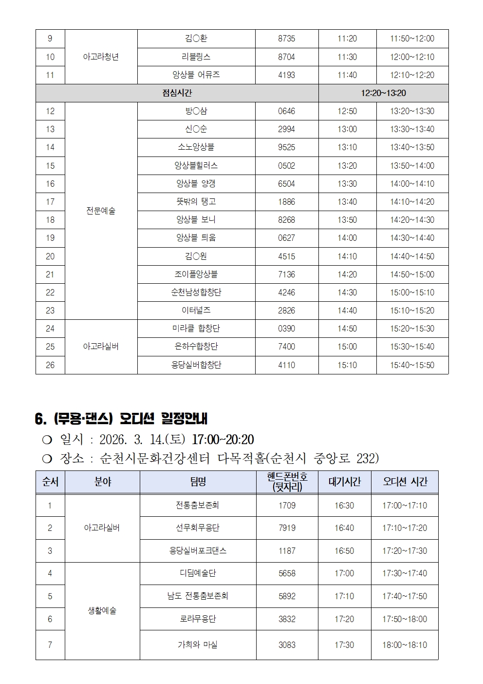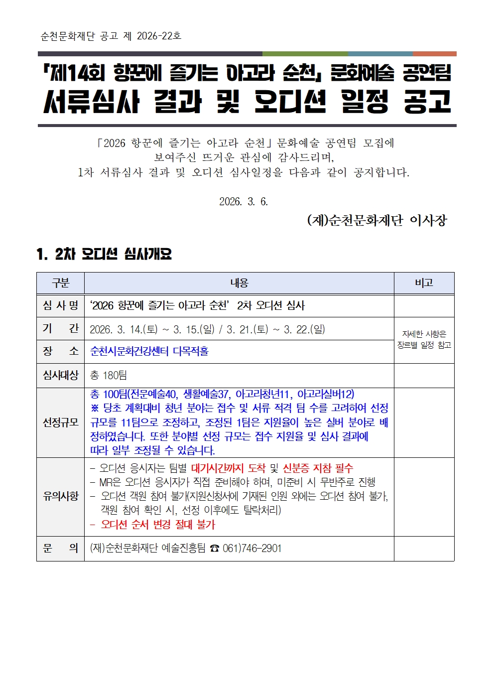 「2026 항꾼에 즐기는 아고라 순천」문화예술 공연팀 서류심사 결과 및 오디션 일정 공고