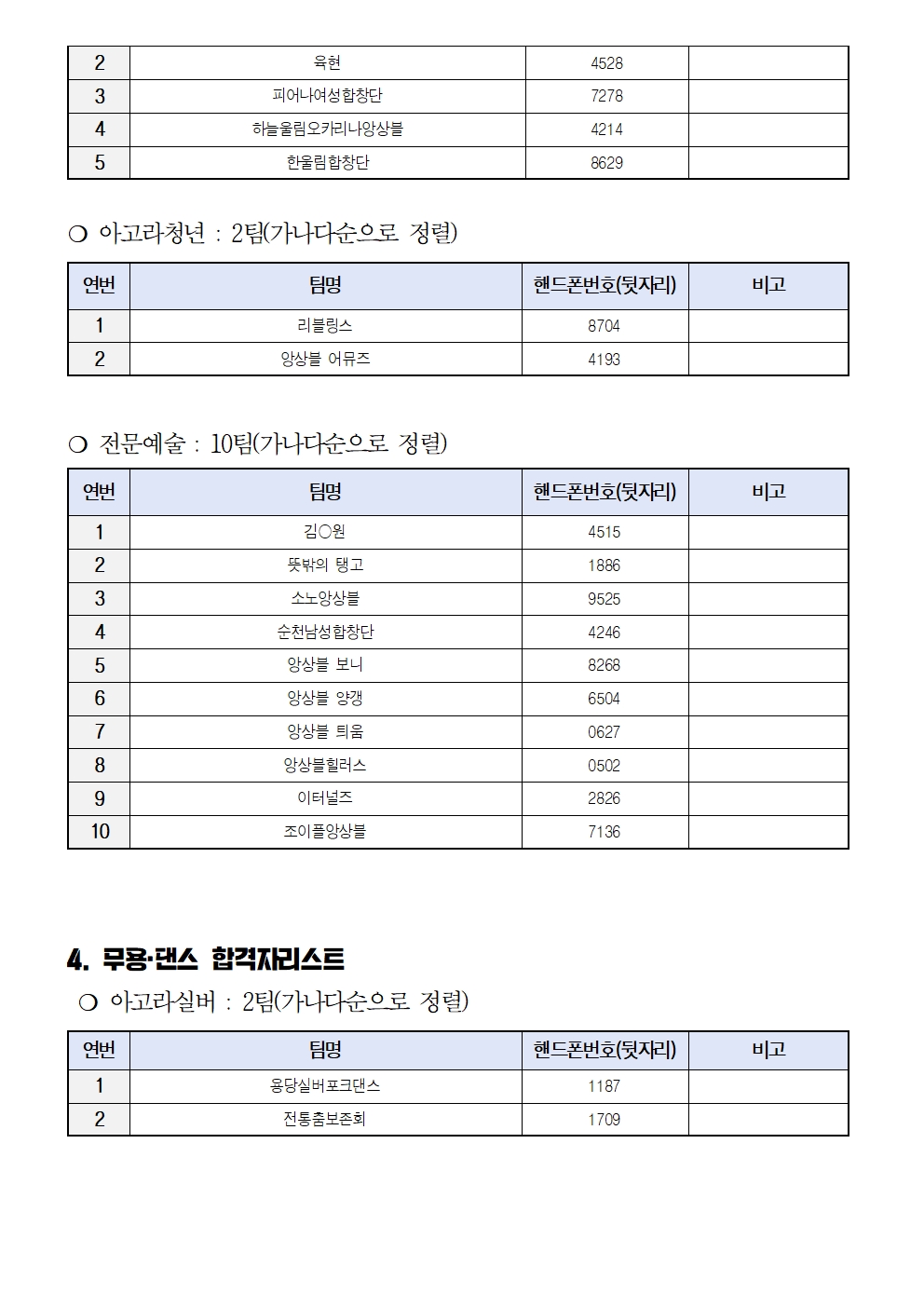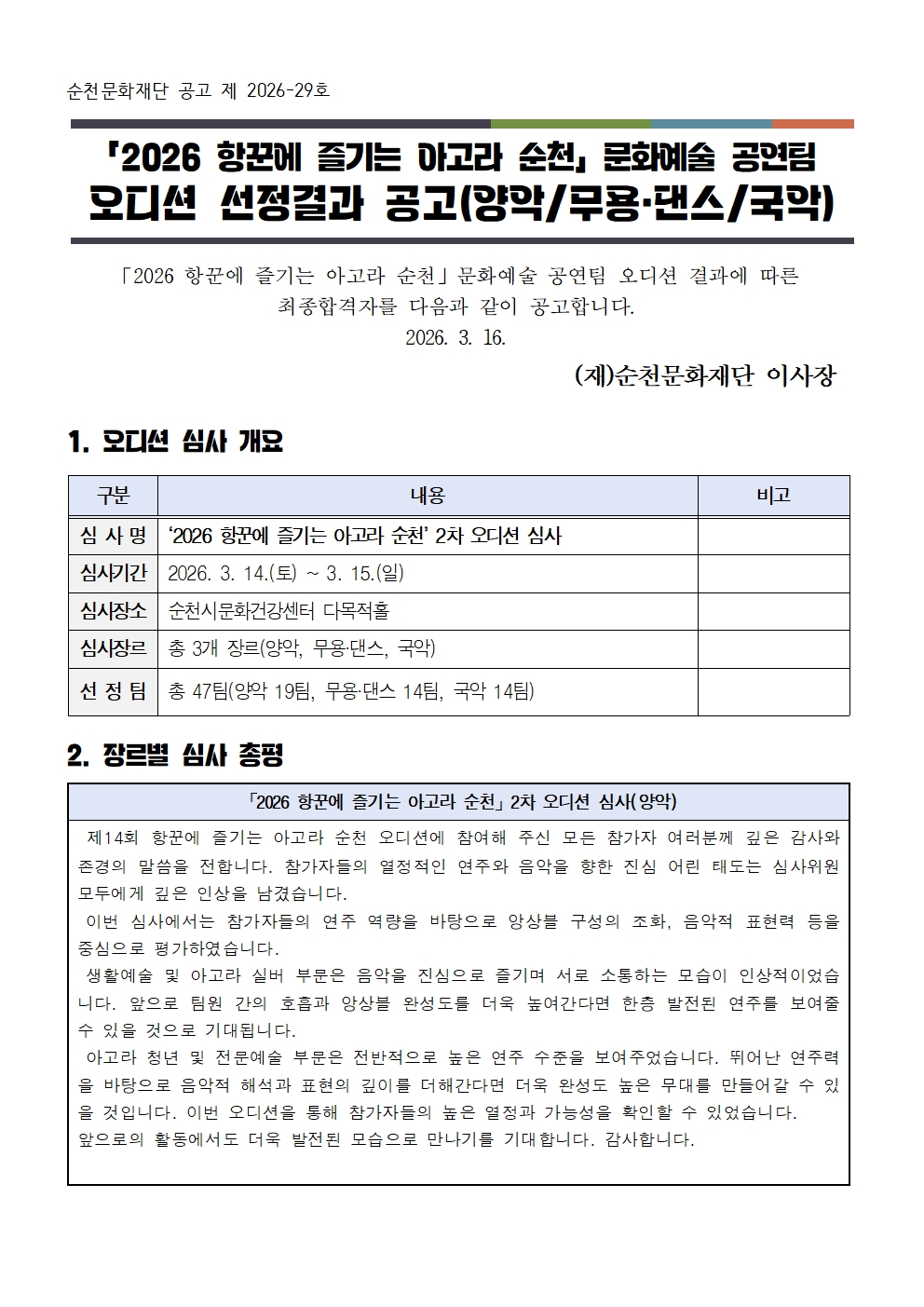 「2026 항꾼에 즐기는 아고라 순천」 문화예술 공연팀 오디션 선정결과 공고(양악/무용·댄스/국악)