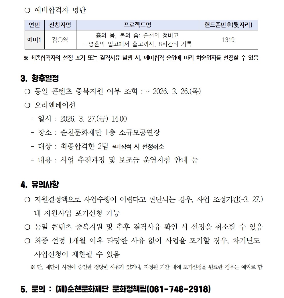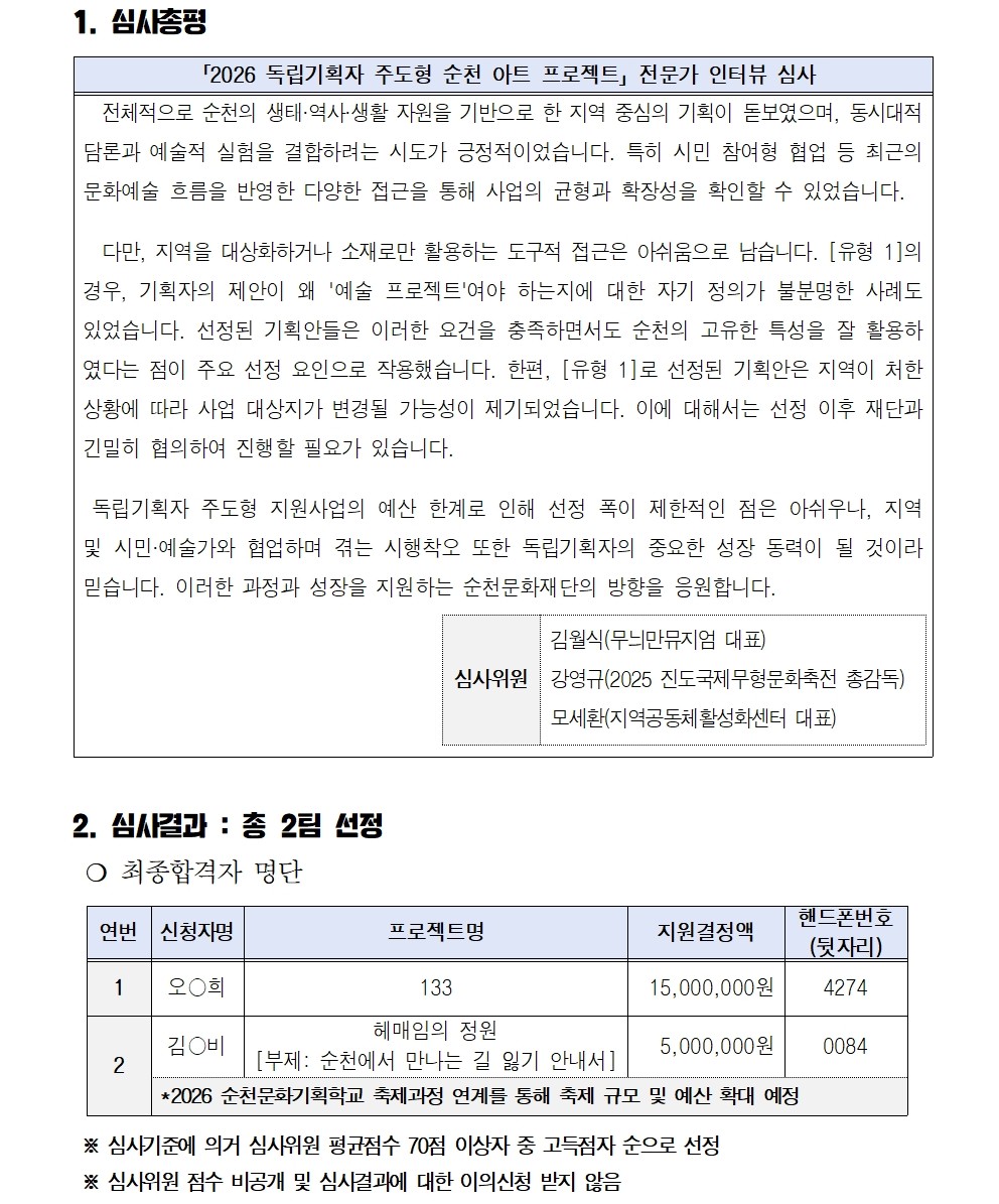 「2026 독립기획자 주도형 순천 아트 프로젝트」최종 선정결과 공고
