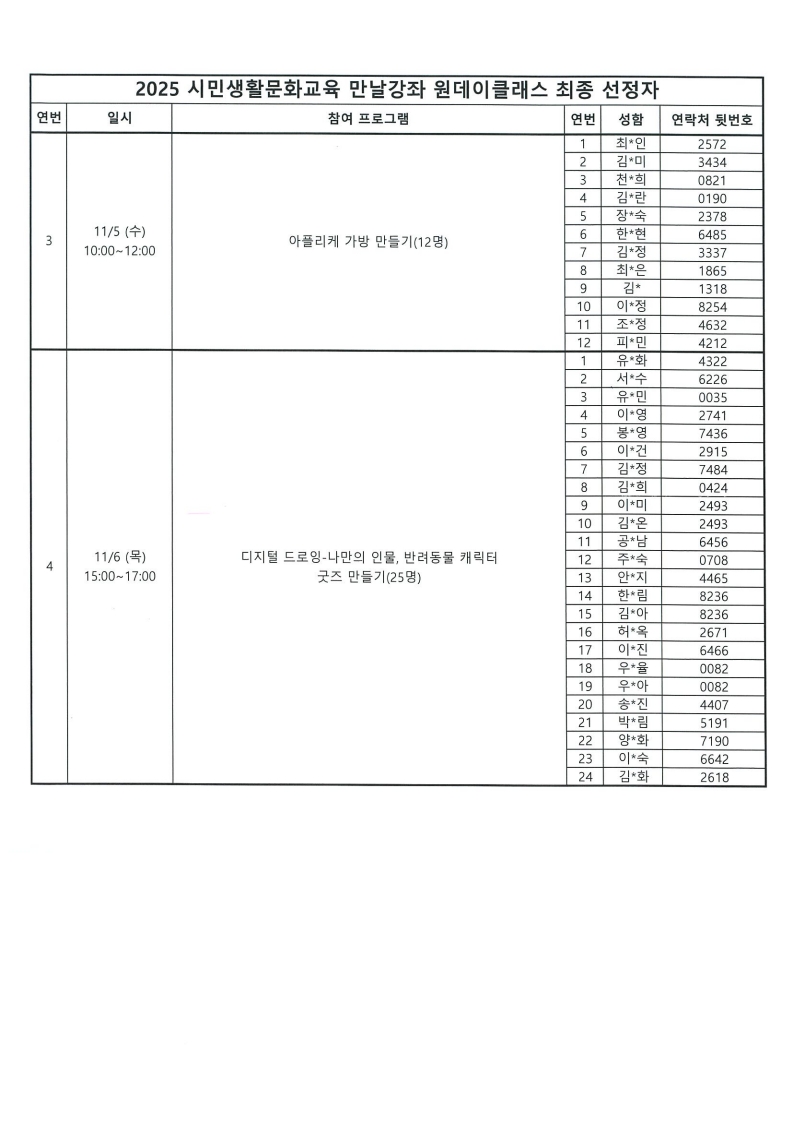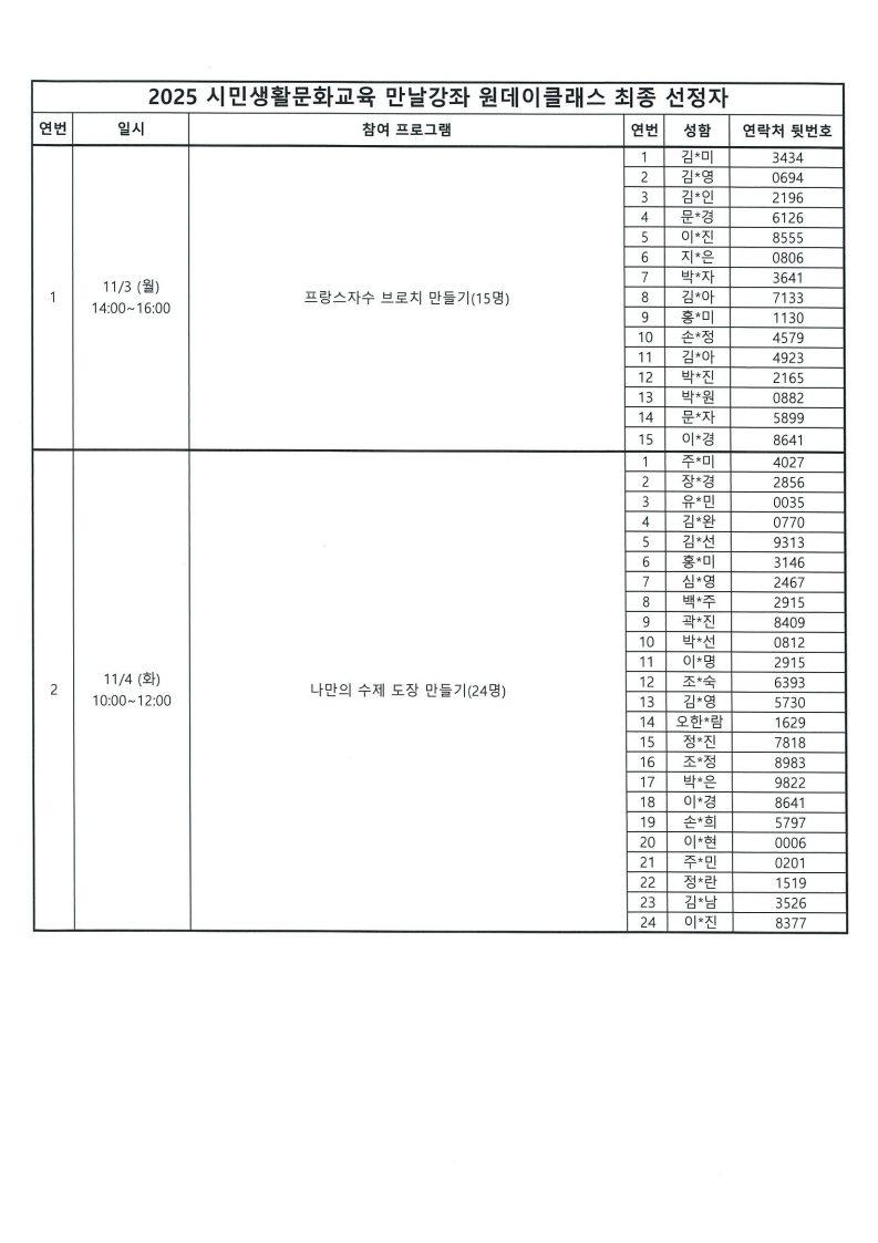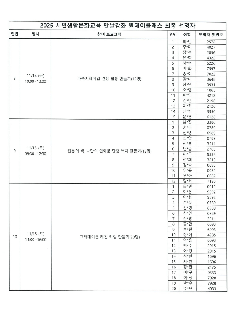 다음과 같이 2025 시민생활문화교육 만날강좌 원데이클래스 최종 선정자 명단을 게시합니다.